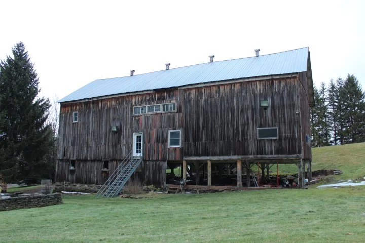 This type of dairy b arn is called a “bank barn” and it closely resembles virtually every other barn in the region, all of which are located next to a small knoll, an embankment that enables, with the addition of a stone ramp and a short bridge, access for a wagon to the barn’s third level. All such dairy barns are organized in the same way: 1) the cows live their entire lives on the ground floor; 2) two enormous hay lofts occupy the second level, from which hay and corn can be dropped to the cows below; 3) the ramp and barn bridge lead onto a “bridgeway” from which hundreds of hay bales can be thrown or moved by rope and hook into the hay lofts. The entire structure of hemlock posts and beams is exposed in the interior of the barn. With the end of farming at each individual farmstead, its barn enters a perilous situation. A barn’s roof is difficult and expensive to maintain and any almost any leak, if not repaired, will eventually lead to decay and the barn’s collapse. In fact, although hundreds of former dairy barns can be seen in every part of Delaware County, most of its 19th century barns are gone or in ruins, except for their virtually indestructable stone ramps. Most owners cannot justify the expense of maintaining an old barn for which no adaptive re-use can be found beyond storage. Maintenance equipment has replaced the cows in the ground floor of our barn, but the hay lofts are just vast empty volumes of space. They are wonderful places for music and dancing and once-a-year games of Barnball.